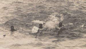 In 1921 Charles Ramsay came to Niuafo’ou as plantation manager. Although he had been severely ill (from gassing during World War I), he took on the job of swimming for the mail. He was the only white man to do so and went out 112 times in all types of weather. On occasions when the ship passed at night, it would blow its siren, and the swimmers would go out in a group, one carrying a lamp. On shore, the islanders would build bonfires to guide the swimmers home.